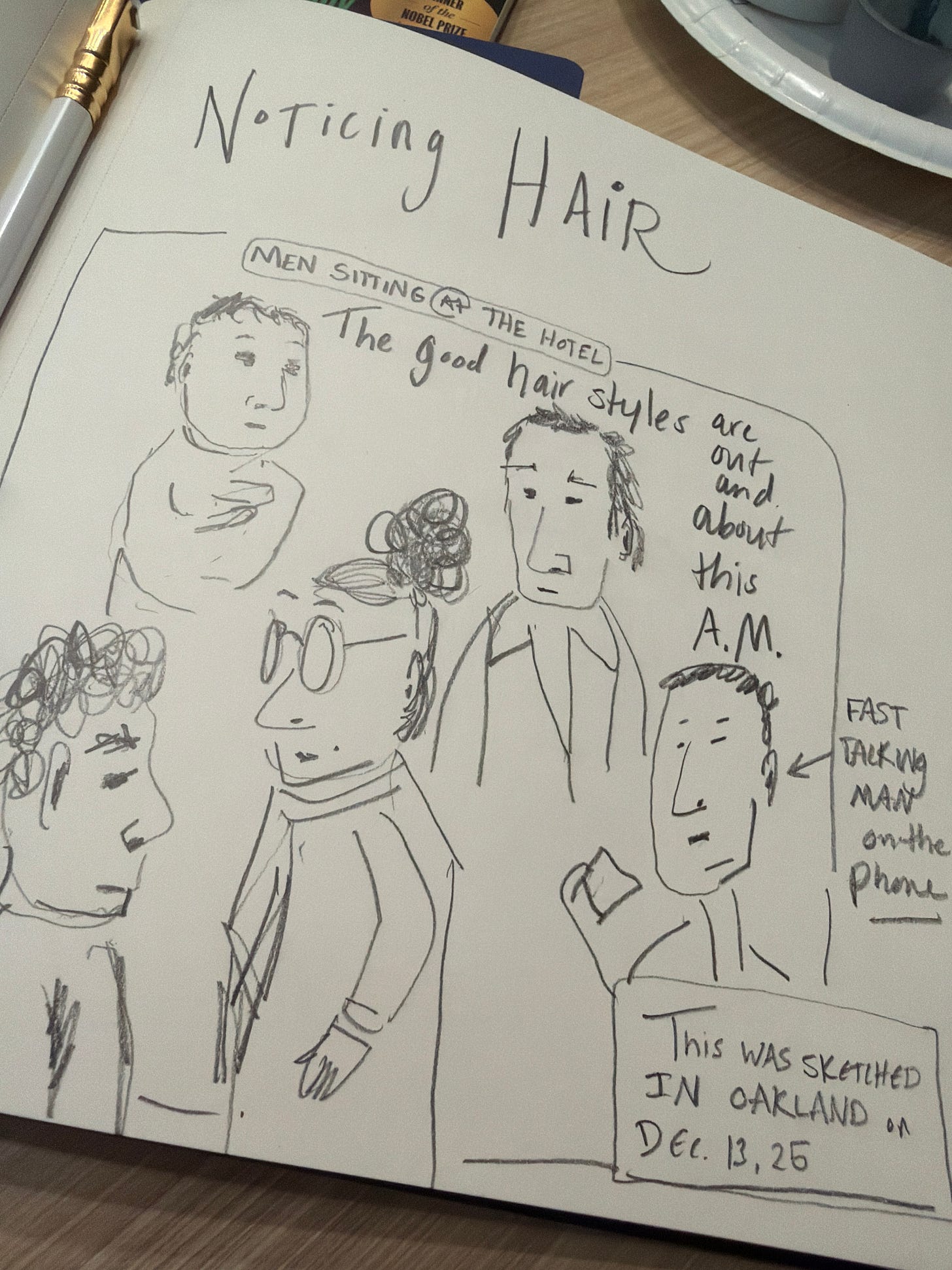 This is in front of me as well. A sketchbook that I was working on noticing by sketching all of these hairstyles so early in this hotel.