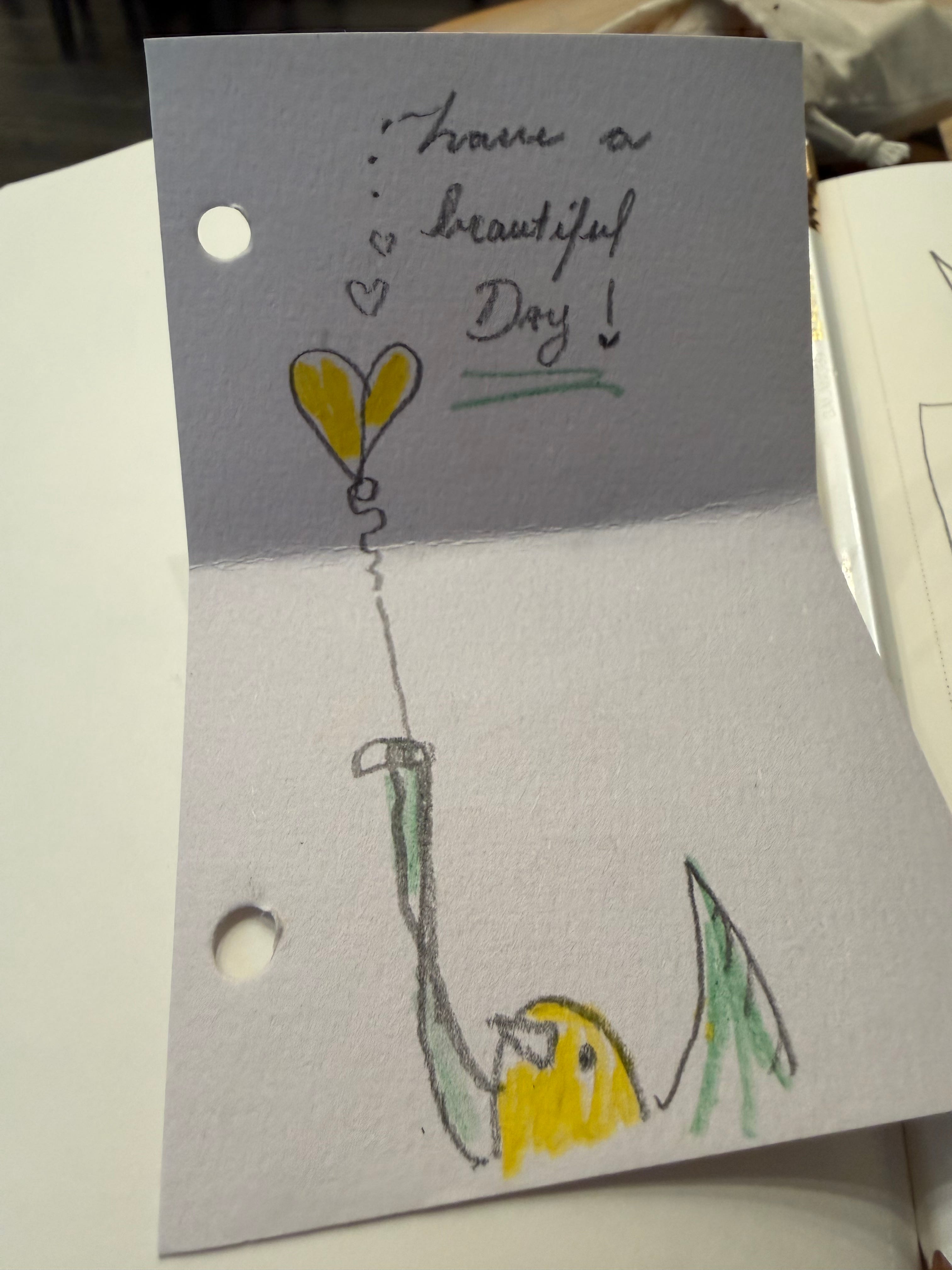 I’m going to leave a piece of art for someone at this table. I don’t know why but I’d like to find a piece of art that someone left behind.